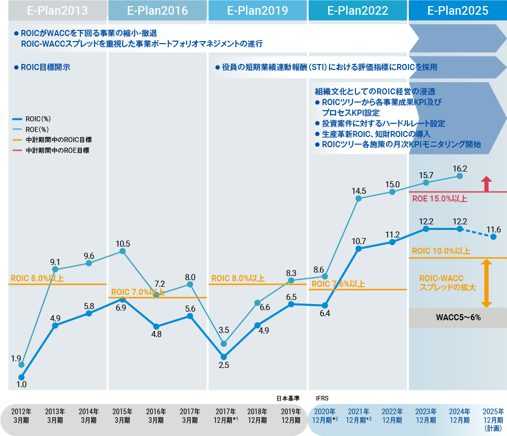 当社グループでは、ROIC(投下資本利益率)をROE(株主資本利益率)とともに経営の最重要指標と位置付けています。中期経営計画E-Plan2013での導入以降、「必要な投下資本を考慮した上で、それに対するリターンを最大化する」というROICの考え方は社内で確実に浸透しています。