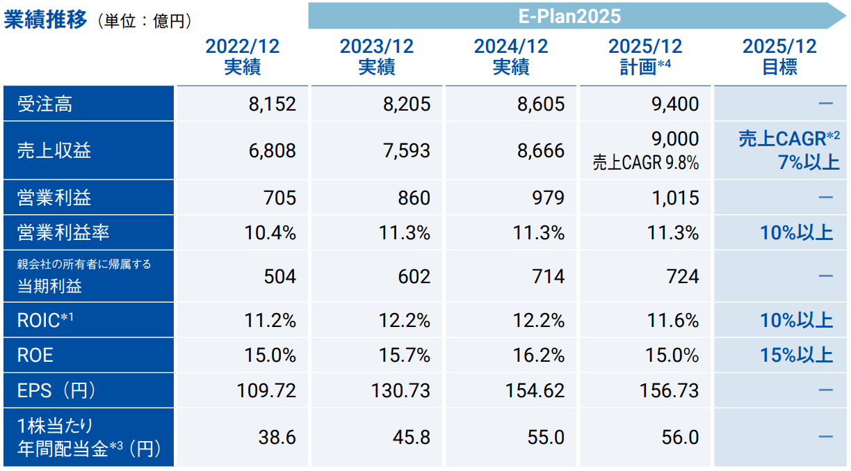 E-Plan2025の最終年度となる2025年12月期の事業環境は、長期化するウクライナ情勢や、米国の関税措置及び米中関係の緊張などから当面は不透明な状況が続くとみています。一方で、エネルギーの安全保障上の理由からLNG等の需要が高止まりしていること、公共・産業インフラに関わる事業においていずれも底堅い需要が望めることから、E-Plan2025の計画を達成できると見込んでいます。