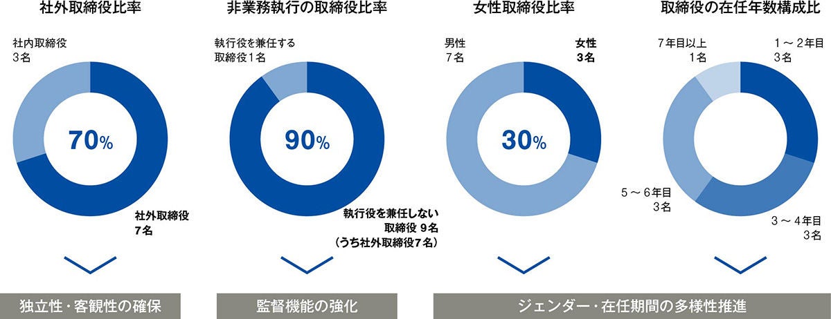2025年12月期に選任された取締役の構成は、取締役総数10名中7名が独立社外取締役で、その内3名が女性となっており、取締役会が引き続き高い独立性と多様性を備えた構成となっています。