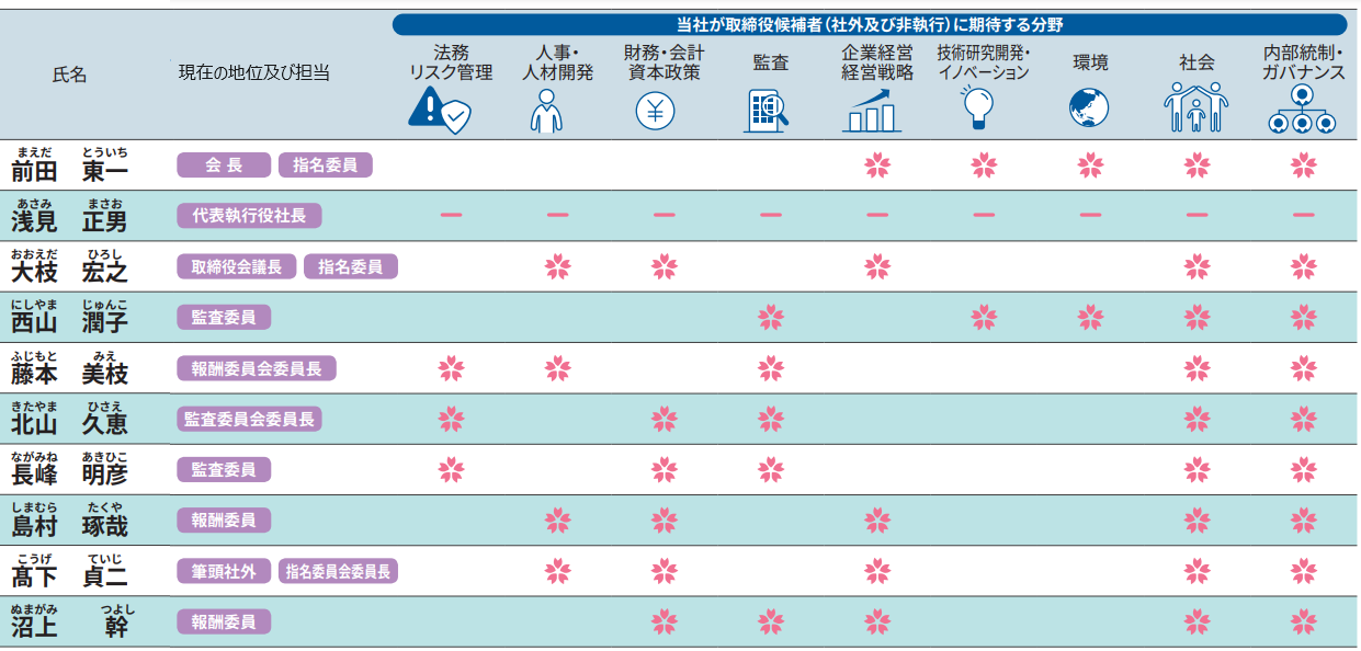 指名委員会は、当社の定める資質要件を満たし、かつ上述の複数の分野における知識・経験を有していることを確認の上、取締役候補者を選定しています。