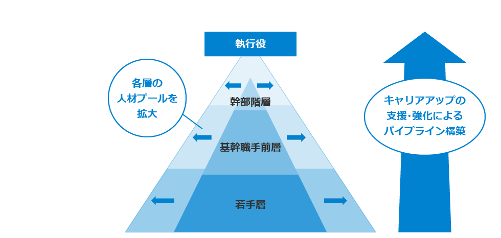 女性従業員を基幹職、基幹職手前、若手の3階層に分類し、各層に合わせたキャリア形成支援の強化・加速を行っています。