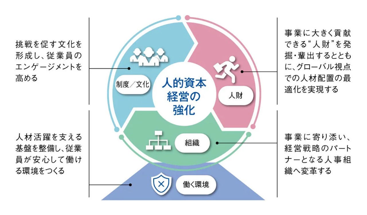 この方針のもと、人材を「資本」として捉え、その価値を最大限に引き出し、「グローバルでの持続的成長」を実現するための基盤整備をより加速させ、「競争し、挑戦する」人材を育成し、グローバルモビリティの向上を通じて最適配置をグループ全体で強化していきます。