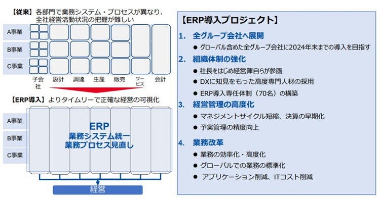 真のグローバル経営を実現するために、ERP(企業資源計画)システムを2024年末までに導入し、グローバル業務標準化を目指しています。導入専任体制(中途採用者と社内人材を含む約70名)をの構築のうえ、組織実行体制の強化を図ります。