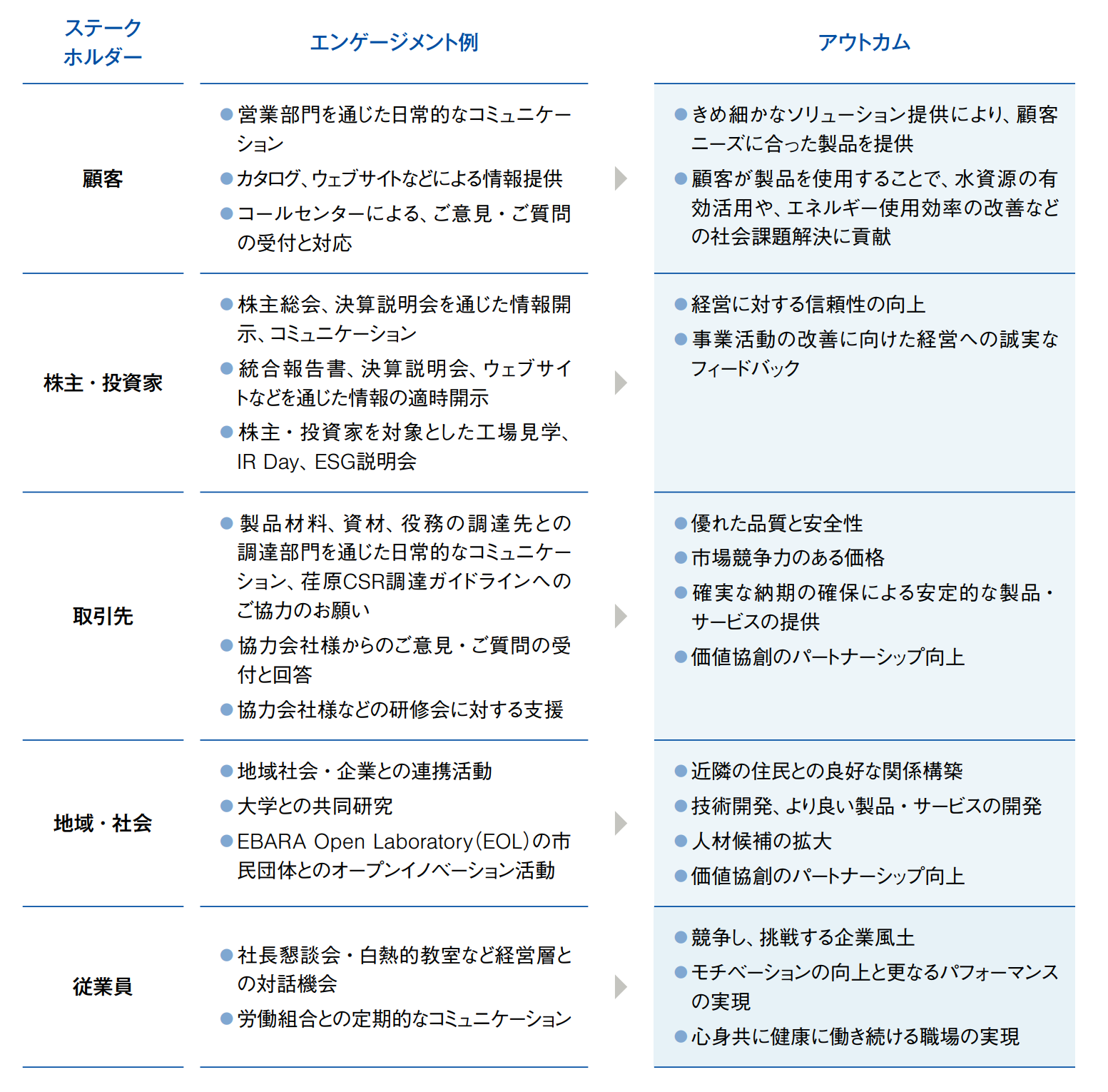 企業経営において、顧客、株主・投資家、取引先、地域社会、従業員などの多様なステークホルダーとの価値協創が重要です。皆様との強固なパートナーシップは、荏原グループの持続可能な成長に不可欠であると考えています。今後も、マルチステークホルダーの皆様と協働し、対話を行いながら、新たな価値創出に取り組んでいきます。