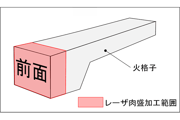 この技術をレーザによって行うのが「レーザ肉盛溶接」です。他の肉盛方法よりも低入熱で行えるので、母材が変形しにくく、密着性も高くて肉盛した金属が剥がれにくいというメリットがあります。今回のプロジェクトでは、新品の火格子の表面にレーザ肉盛を行って耐久性を高め、長寿命化にチャレンジしました。