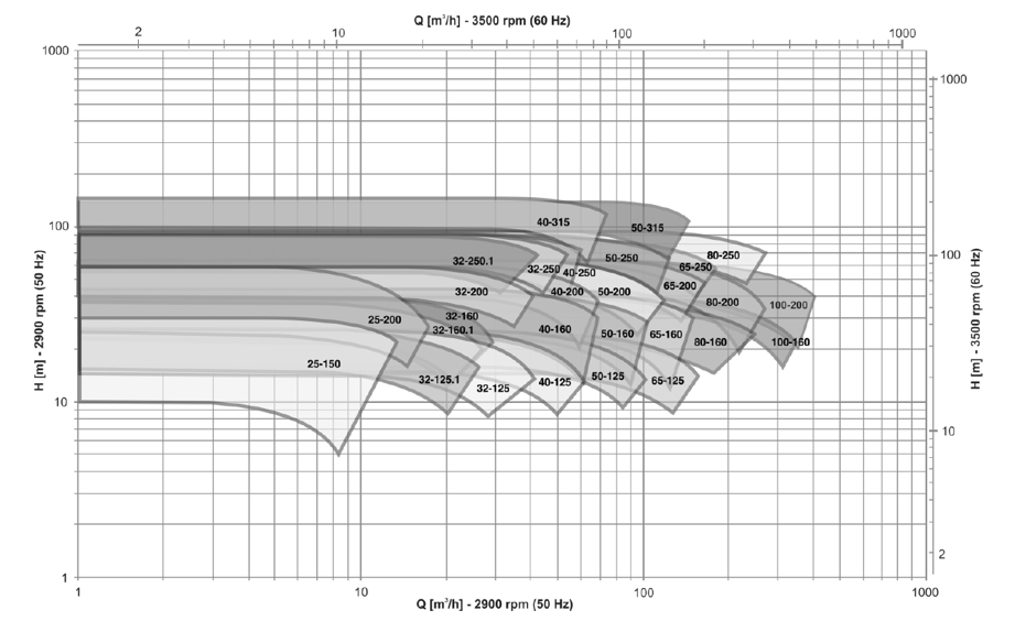 Bomba normalizada bajo ISO 2858, mono etapa, de succión simple horizontal y descarga vertical. Construcción “Back-pull-out”, que permite mantenimiento sin necesidad de desacoplar las tuberías. Diseño hidráulico según ISO 9906 anexo A. Fabricada en hierro fundido, acero inoxidable, acero dúplex o bronce, con sellado mecánico o prensaestopa, caja de rodamientos lubricados con aceite o auto lubricados. Tamaños desde 25mm hasta 200 mm. Utilizada para agua limpia hasta temperatura de 70ºC (temperaturas superiores, consultar opciones). Caudal Max: 1060 m³/h – Caudal Mín: 10 m³/h; Presión Máxima: 120 mca – Presión Mínima: 8,0mca.