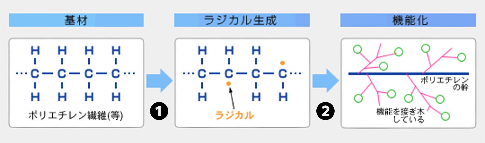 放射線グラフト重合技術は、放射線の高いエネルギーを活用して、合成繊維などの既に成型済みの高分子材料(以下基材と略称)に新たな機能をプラスできる技術です。