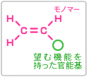高分子の材料となる小さな分子(反応性モノマー、切り口と反応しやすい部分を持っている)を、切り口と反応させて、枝状の構造にします(専門用語でラジカル重合という)。反応性モノマー分子に別の機能を持たせておくことで新たな機能をプラスできます。