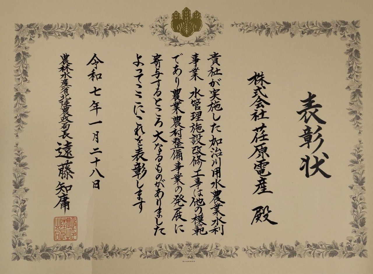 弊社が施工した「加治川用水農業水利事業水管理施設改修工事」が北陸農政局局長表彰工事として