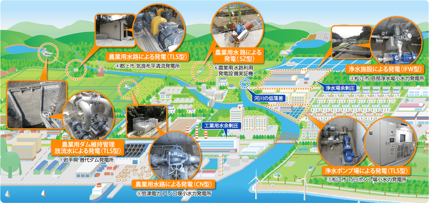 当社では、ダム利水や農業用水路、水道施設等の水資源を有効活用して、効率よく安定的に発電ができるシステムを豊富にラインナップしております。
