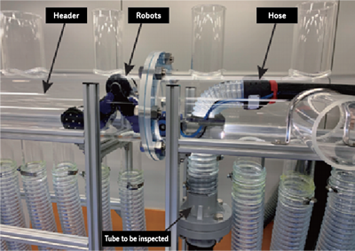 The robot is placed in the inspection opening in the header of water tubes. After moving to the water tube to be measured, it inserts a sensor into the tube to automatically and continuously measure the boiler tube thickness from the inside. The robot succeeded in a demonstration test of the measurement of boiler water tube thickness in December 2019. This eliminates preparation work including the cutting of parts of the water tube to shorten working time and reduce the materials and equipment necessary, both increasing the safety of employees and reducing waste.