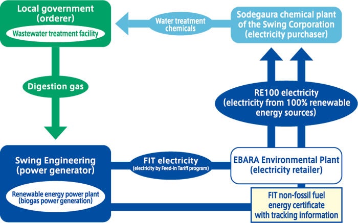 The electricity generated by the renewable energy power generation project run by Swing Corporation is supplied to its chemical plant in Sodegaura through a feed-in tariff scheme. Combined with a non-fossil certificate with tracking information, it is provided as 100% renewable energy (RE100) power.