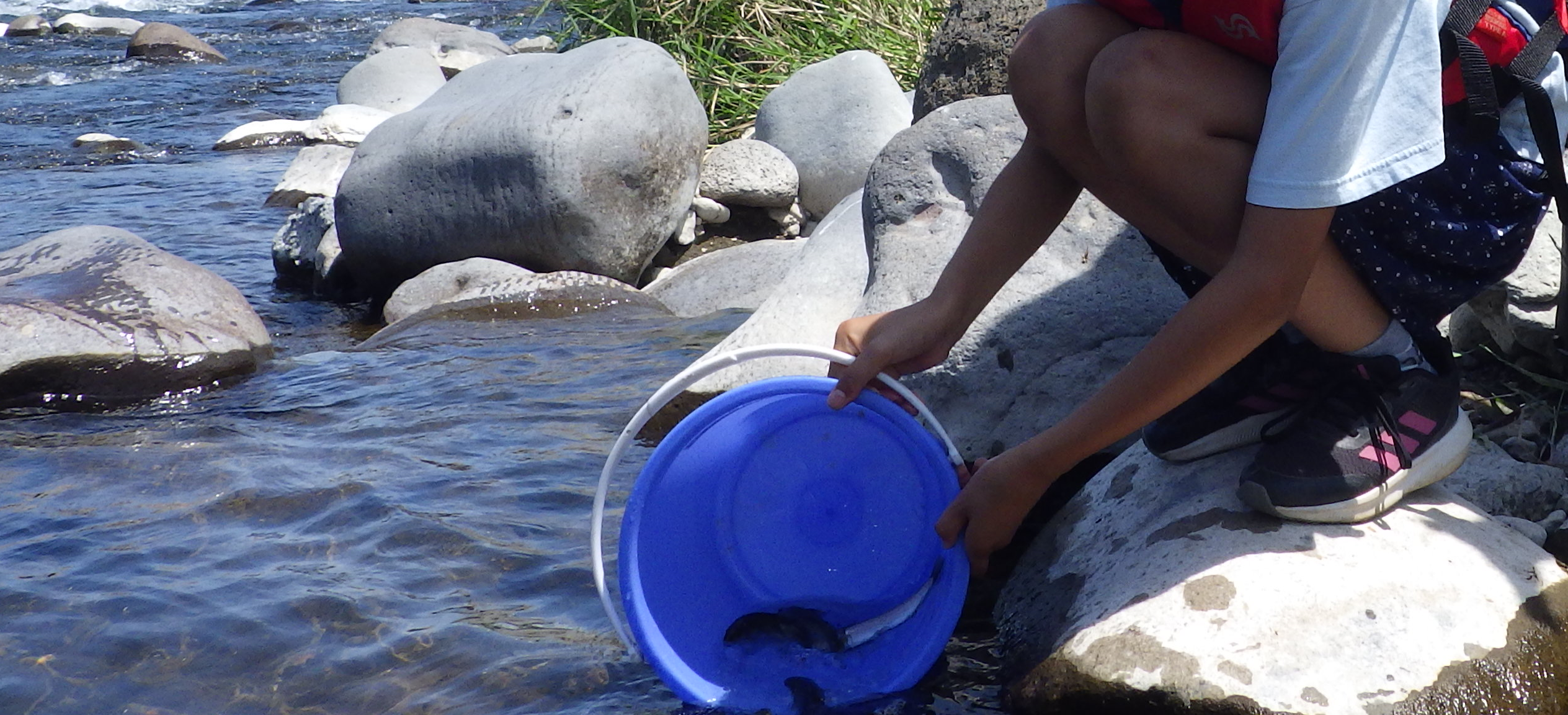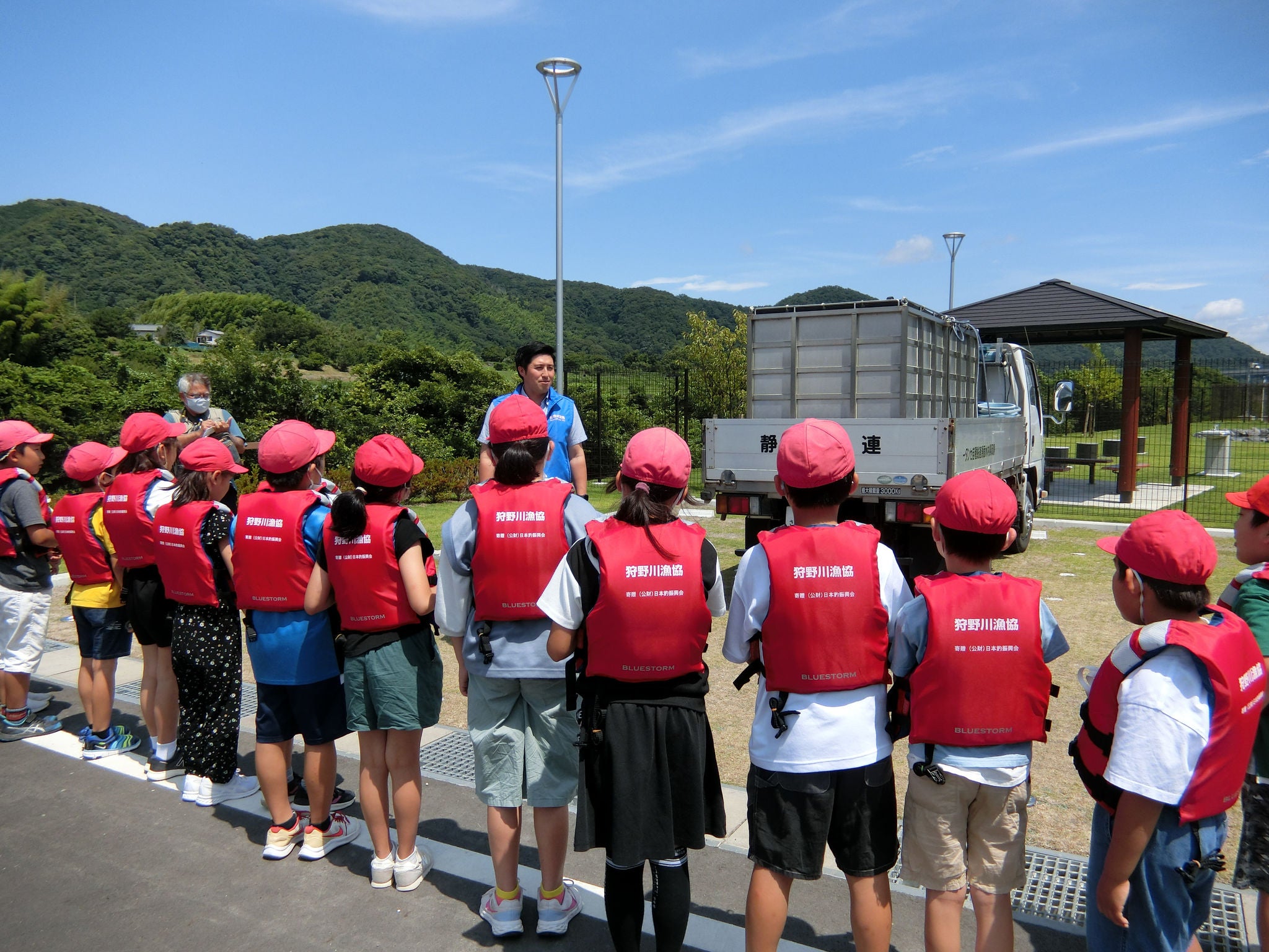 「クリーンセンターいず」は、ごみ焼却施設で使用した水を外部に排出しない、水のクローズドシステムを採用するなど、周辺環境の保全に配慮しています。狩野川には清流にしか生息しない生き物たちが多く棲んでおり、鮎の稚魚放流イベントを通じて、施設の環境配慮の取り組みを紹介するとともに、地域の子どもたちへ環境学習の場を提供しています。