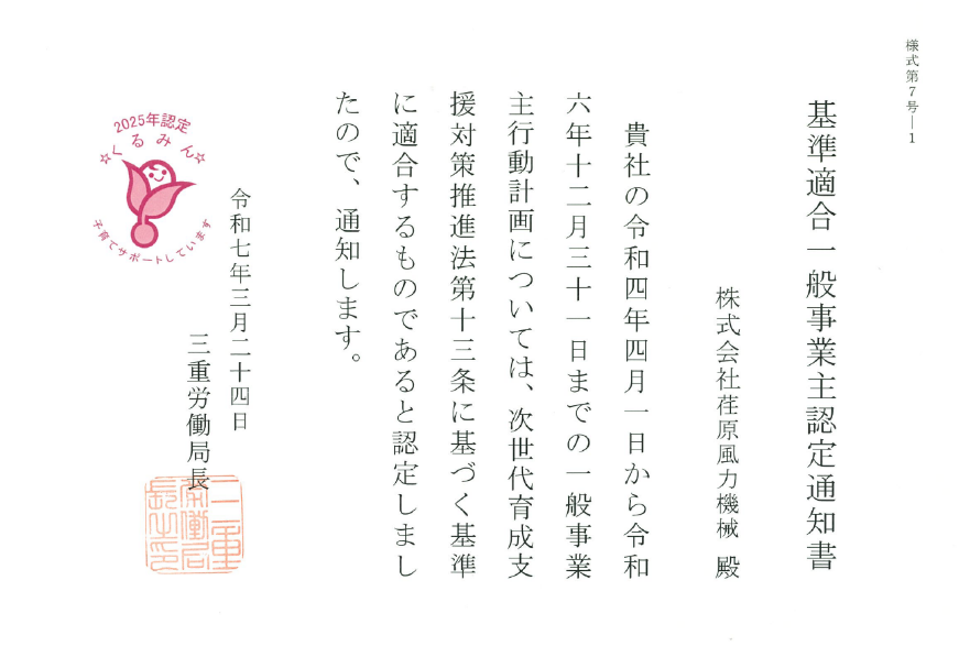2025年3月24日付で三重労働局長から、次世代育成支援対策推進法(次世代法)に基づき、仕事と子育ての両立支援のための行動計画を策定・実施した中、一定の要件を満たしている企業として認定されました。