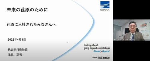 CEO Asami began by explaining the company's history, which is celebrating its 110th anniversary since its founding, to new employees, and then spoke about the company's long-term vision for 2030, "E-Vision 2030." We aim to become a globally excellent company by contributing to society through our contributions to ESG and SDGs and simultaneously increasing social and environmental value as well as economic value. He explained the vision for our company and five material issues outlined in E-Vision 2030. "For the Future of Ebara"