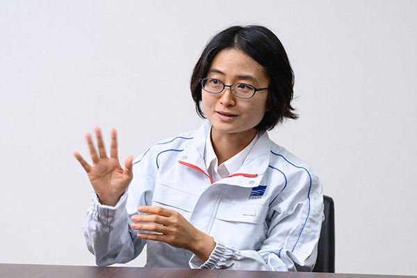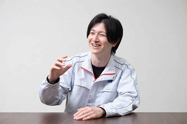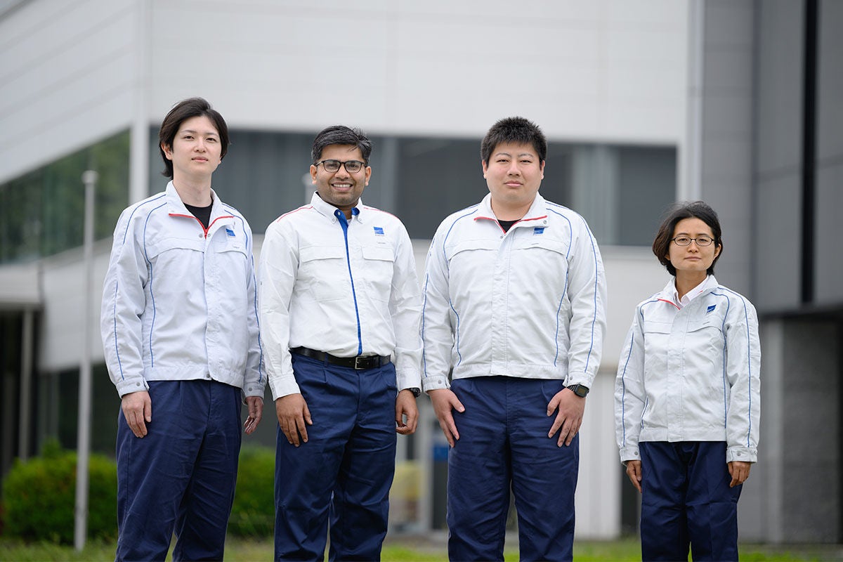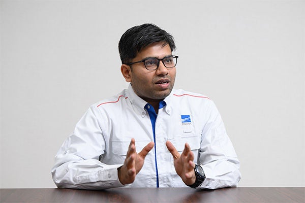 Keisuke Hibino and Miho Isono of the Press Team of the Prototype and Base Collaboration Promotion Division of the Manufacturing Technology Development Department of the Production Process Innovation and Quality Assurance Department, who are members of EMTAC, and Kenta Tokairin and Chinchansure Mallinath of the Global Pump Development Division of the Overseas Business Development Department of the Building Service & Industrial Company in charge of the development of pumps for overseas markets discussed the contents of the discussion.