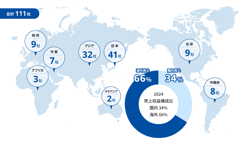 荏原グループは、世界111社に及ぶグローバルネットワークを持ち、世界中の人々の暮らしと産業を支えています。各地域のニーズに合わせた製品の提供と、販売後のサービス&サポート体制の強化にも注力しています。海外売上比率も約66%を占め、安定した収益構造となっています。