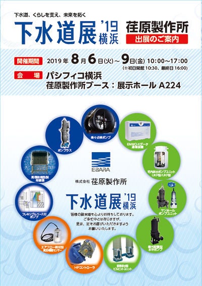 荏原は、パシフィコ横浜で8月6日から9日までの4日間開催される下水道、くらしを支え、未来を拓く「下水道展’19横浜」に出展いたします。