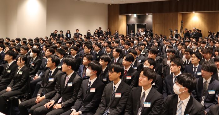 昨年に引き続きグループ合同での対面入社式とし、新入社員254名が出席しました。当日は、3月に新たに社長に就任した細田から、社会課題の解決と共に成長してきた荏原グループの歴史や、社会人として「プロ意識をもつ」ことの重要性について話をし、グループの新たな仲間を歓迎しました。